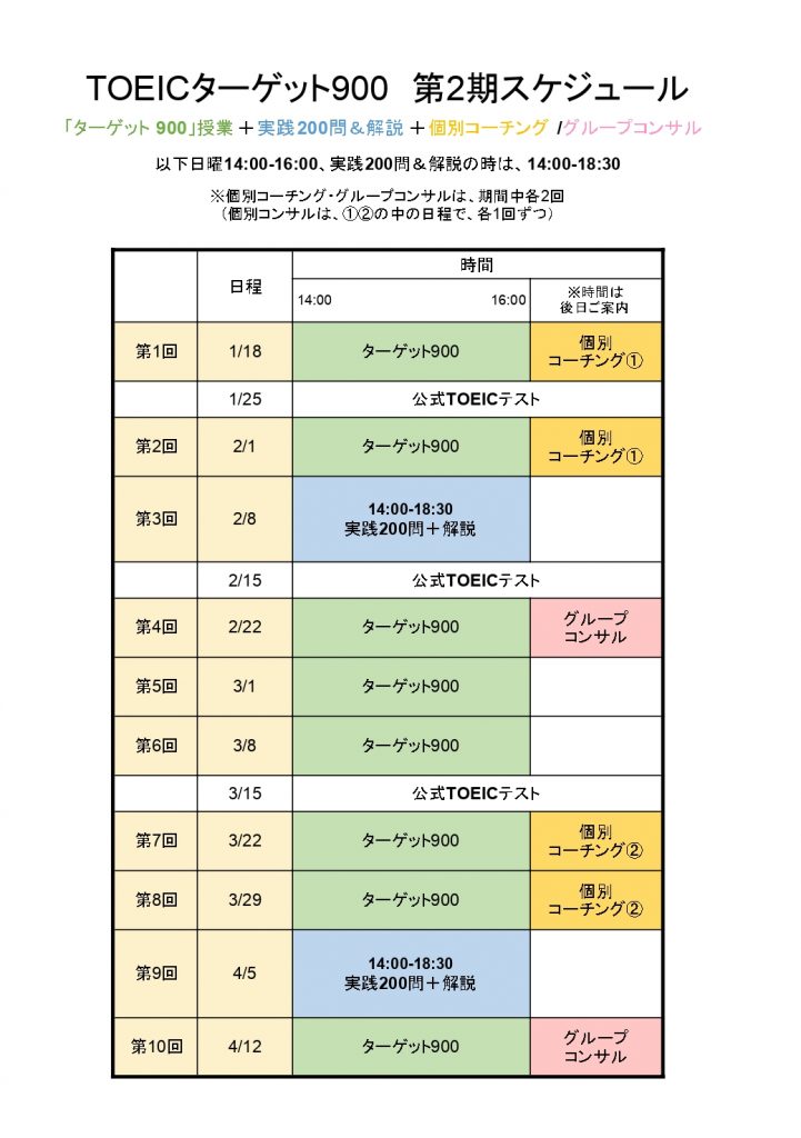 日程 | 【ターゲット900授業+実践200問&解説(4時間)】 2026年1月~4月 以下日曜日 14時00分~16時00分 ①1/18 ②2/1 ③2/8※ ④2/22 ⑤3/1 ⑥3/8 ⑦3/22 ⑧3/29 ⑨4/5※ ⑩4/12 ※公式TOEICテスト日(1/25、2/15、3/15)はお休みです。 ※4月日程は、公式テスト日程により変更する場合があります。 ※「実践200問+解説」日(2/8と4/5)は、時間が14時~18時30分になります。 毎月:個別コーチングor グループコンサル 【個別コーチング】(一人30分/期間中2回 1月・3月予定) 生徒さん一人一人に、日々の具体的な学習スケジュール構築の確認やコンテンツのアドバイスを行います。 毎週の授業の復習以外に、個々の弱点ポイントを次の月で補強できるように、自宅学習で日々何をやればいいのか、迷わずに具体的に自分で取り組めるように教えます。 【グループコンサル】(60分/期間中2回 2月・4月予定) めぐ校長と同じ目標を持つ仲間たちと悩みの共有や情報交換ができるメンバー交流会。 学習のモチベーション維持につながります。 ※日程はお申込み後にご案内します。 |
